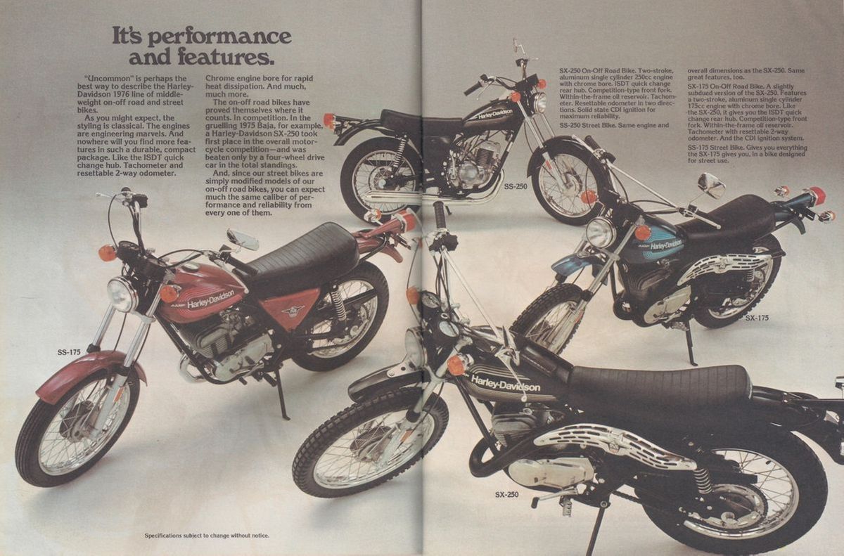 Cuando Harley-Davidson fue comprada por AMF a mediados de los años 70, la empresa siguió produciendo estas motos de motores pequeños, especialmente la SS-250, equipada con un motor monocilíndrico de dos tiempos de 20 CV.